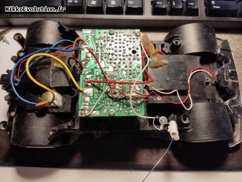 y'avait du ménage a faire, j'ai tout passer au spray facom spécial contact électrique, j'en ai profiter pour remplacer graisse du moteur etc... jusque la elle refonctionnait impec. cela n'a pas durer longtemps, j'ai réinvesti en chargeur, piles etc... rien n'y a fait. la voiture quand je met juste l'inter sur ON les roues arrière avance toutes seules doucement et rien d'autre ne marche, pas même l'interrupteur pour le son situer a l'arrière. Je redémonte, et la SURPRISE!! un petit fil noir qui part du compartiment pile et PAS LA MOINDRE IDEE d'où il peut venir se mettre, j'ai scruté platine inter, j'ai chercher des schéma électrique de la voiture, j'ai rien trouver.... donc si quelqu'un aurais une info la dessus cela serait extrêmes aimable