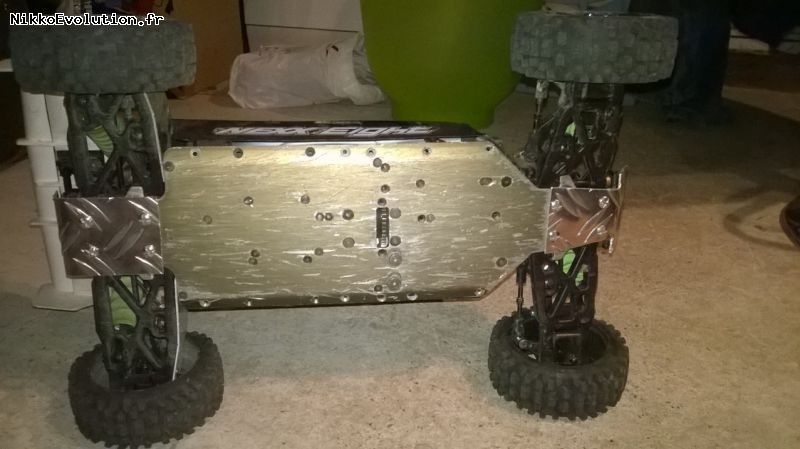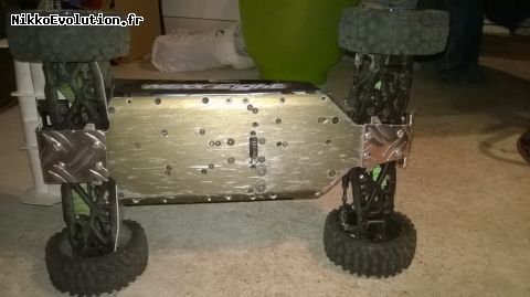 comme j'ai vachement assoupli mes amortos, le châssis frotte pas mal au sol et commence à être pas mal raclé , j'ai donc fabriqué deux protections en alu à l’avant et à l'arrière