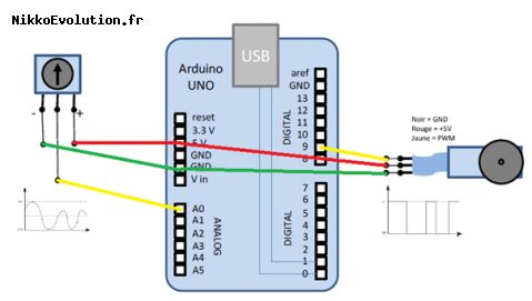 Le potentiomètre envoie sa valeur sur une entrée analogique (quand on lis la valeur de l'entrée on obtiens une valeur sur 10 bits soit entre 0 et 1023).