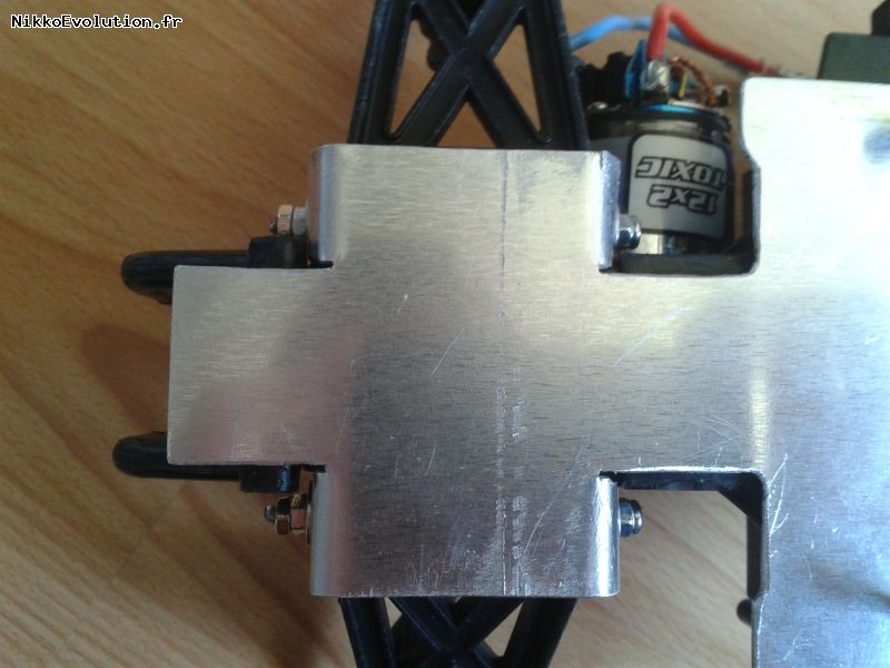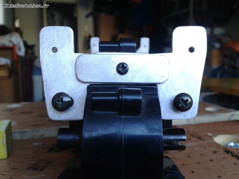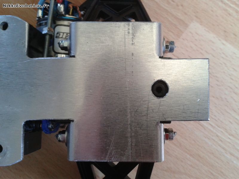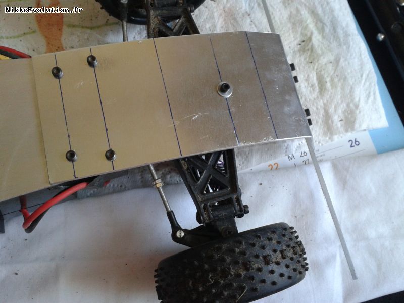 Dans la plaque en aluminium, faire un renfort pour la boite de vitesse avant en positionnant correctement les trous de fixation. Faire des languettes au niveau des supports de bras de suspensions pour consolider l'ensemble et éviter la casse de la boite de vitesse à ce niveau :