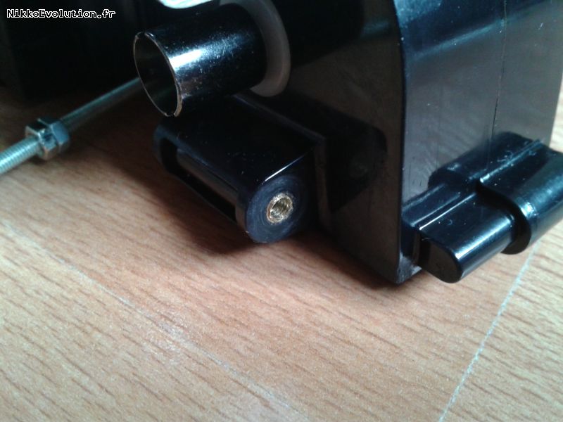 Percer avec un foret de 4 mm les triangles de suspensions (sauf au niveau du pas de vis), puis y insérer trois inserts découpés dans le tube en laiton :