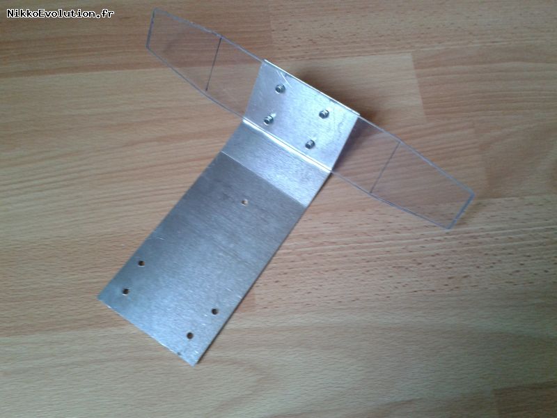 Une partie centrale faite dans la plaque d'aluminium, qui reliera aussi les deux renforts de boite pour avoir un châssis rigide ; et une partie avant en plexiglas pour absorber au mieux les chocs :