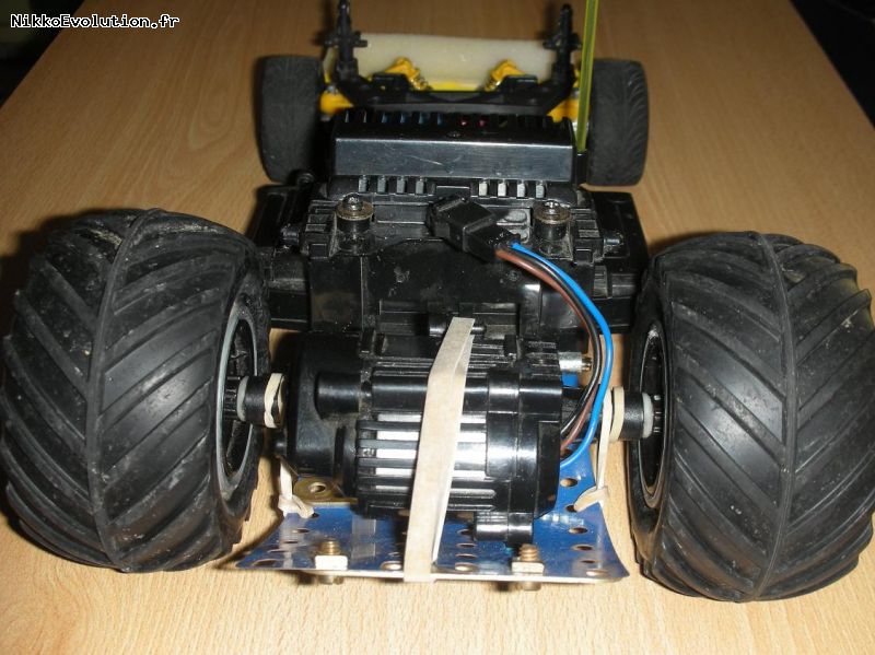 J'ai adapté des pneus d'un vieux buggy nikko dont il ne me restait plus que les roues sur les roues de ma voiture. Pour cela j'ai utilisé des raccords PVC pour permettre d'augementer le diamètre des jantes. J'ai ensuite fixé le tout après avoir préalablement disposé à l'intérieur de la mousse. J'ai fait ceci seulement sur le train arrière. Ainsi, forcé d'enlever une pièce en raison de la taille des pneus, j'ai du enlever les suspensions. Celles-ci sont plus ou moins remplacer par la plaque de mécano qui permet une certaine résistance et qui fait donc office d'amortisseur.